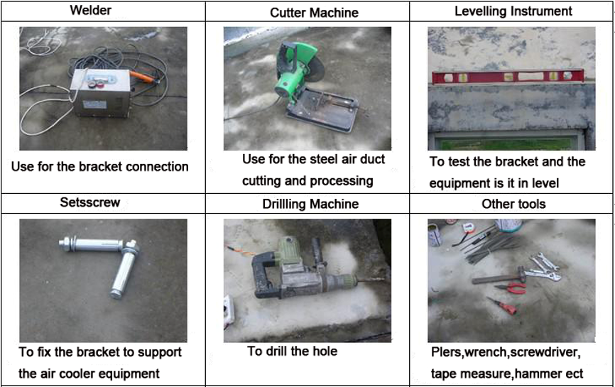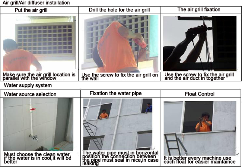 After the bracket installation finish, put the air cooler equipment first. Use the string to fasten the air cooler, put down in slow, and the workers should fasten the seat belt, wear the slipper is forbidden. After the machine installation, please also clear the water tank of the air cooler, in case blocking in the future.